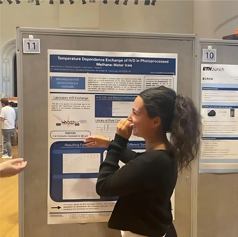 Un autre volet de mes recherches concerne le deutérium, un isotope de l’hydrogène (l’élément le plus abondant dans l’univers). J’explore les réactions chimiques impliquant le deutérium qui peuvent se produire durant les étapes de formation des étoiles et des planètes. Ces réactions me permettent d’étudier comment les molécules enrichies en deutérium se forment et évoluent. Mon objectif est de comparer les résultats de ces expérimentations avec les observations des molécules présentes dans les comètes, notamment leurs abondances isotopiques. Les comètes, considérées comme des “archives chimiques” du Système solaire primitif, offrent une opportunité unique de tester les modèles développés en laboratoire.